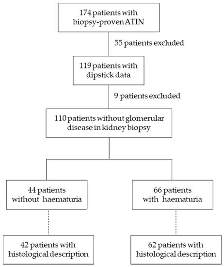 We performed a retrospective, observational study of biopsy-proven ATIN cases between January 2010 and December 2018 using data available in the Glasgow Renal Biopsy Registry. All subjects gave their informed consent for inclusion before they participated in the study. The Registry was conducted in accordance with the Declaration of Helsinki and with institutional ethics committee approval, which covered this study. It is the registry of the Glasgow Renal and Transplant Unit, a large tertiary adult nephrology centre which serves a population of 1.5 million in the west of Scotland. A total of 174 patients had biopsy-proven ATIN. Specimens were examined by a specialist renal pathologist to confirm the diagnosis of ATIN; cases with another primary renal diagnosis and co-existing interstitial nephritis were excluded. Patients without dipstick data at ATIN diagnosis were also excluded from the analysis (Figure 1), leaving 119 patients with haematuria information. An additional 9 patients were excluded because of the coexistence of a pathological diagnosis of ATIN with a second pathological diagnosis of a known cause of haematuria such as glomerulonephritis or vasculitis. This left 110 patients for the main analysis of potential differences between patients with and without haematuria with respect to age, sex, comorbidities, renal function, aetiology and outcomes (development of CKD, acute/chronic dialysis, kidney transplant, relapse). An analysis of histological findings in kidney biopsies was also performed on the 104 samples in which these were available (Figure 1).