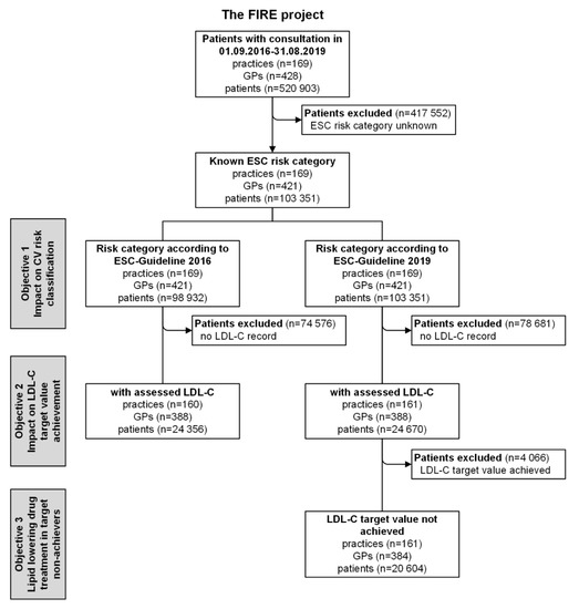 In Europe, the most widely used risk classification scheme is the one proposed by the European Society of Cardiology (ESC) and the European Atherosclerosis Society (EAS). It divides patients into four risk categories ranging from “low risk” to “very high risk” [4,5]. To lower CV risk, the ESC/EAS specifies LDL-C target values for each risk category and, where required, recommends pharmacological treatment to achieve those target values. In August 2019, a major update of the ESC/EAS guideline for the management of dyslipidemia was published, with changes to the CV risk classification scheme and LDL-C target values [4]. The revised CV risk classification scheme includes adaptations to the way morbidities and laboratory values are accounted for. Furthermore, LDL-C target values were lowered for most risk categories. The 2019 update on the ESC/EAS guideline is substantial, and it necessitates risk classification as well as LDL-C target value to be updated in certain patients. Given its complex nature and the interplay of factors relevant to risk classification, the proportion of patients actually requiring a change in risk classification and LDL-C target value in general practice is uncertain. Furthermore, it is unclear how the proportions of patients achieving LDL-C target values will change compared to the 2016 guideline, and what the related therapeutic implications are for patients in real-life general practice.