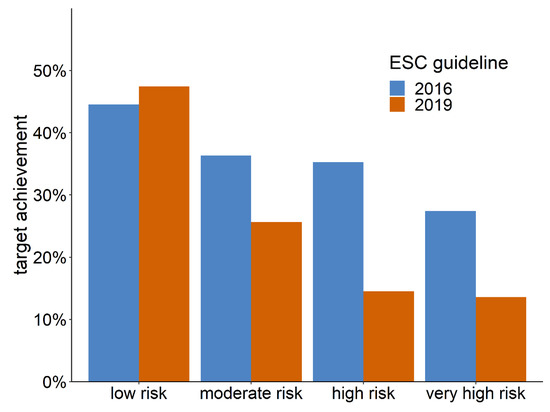 LDL-C target values were adopted as reported in the ESC/EAS guidelines. In 2016, target values were <3.0 mmol/L for low/moderate risk, <2.6 mmol/L for high risk, and <1.8 mmol/L for very high risk; in 2019 target values were <3.0 mmol/L for low risk, <2.6 mmol/L for moderate risk, <1.8 mmol/L for high risk, and <1.4 mmol/L for very high risk.