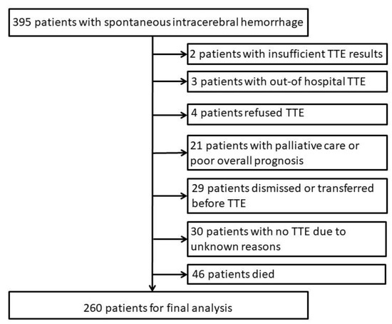 During the study period, 395 patients with sICH were admitted to our stroke center. Of these, 260 (65.8%) patients received TTE as part of their work-up. Main reason not to perform TTE was death during the hospital course in 46 (34%) patients (Figure 1). In 30 patients (22.2%), the reason for the cancellation of TTE could not be determined retrospectively.