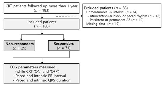 Between January 2010 and June 2018, we identified 183 CRT patients with more than one-year of follow-up. Of the 183 CRT patients, 83 were excluded for AV block or ventricular paced rhythm (n = 45), persistent/permanent AF (n = 19), or missing ECG/Echo data (n = 19) (Figure 1). The remaining 100 patients were included in our final analyses. The mean (±SD) age of our patients was 65.7 ± 11.5 years and 30 patients had ischemic causes of HF. Baseline LV systolic functions were severely depressed in all patients, with a mean (±SD) LV EF of 24 ± 6%. The mean (±SD) values of intrinsic QRSd and PRi were 166 ± 36 ms and 199 ± 34 ms, respectively. LBBB morphology was observed in 80 patients.