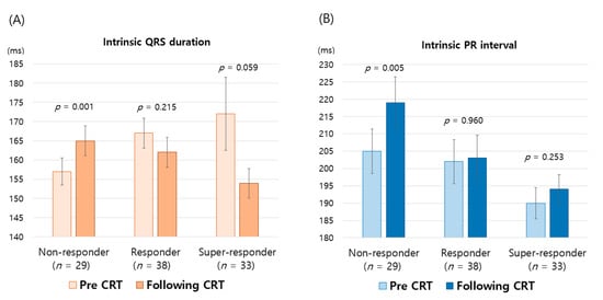 Changes in the native QRS duration (A) and PR interval (B) according to the degree of cardiac resynchronization therapy (CRT) response.