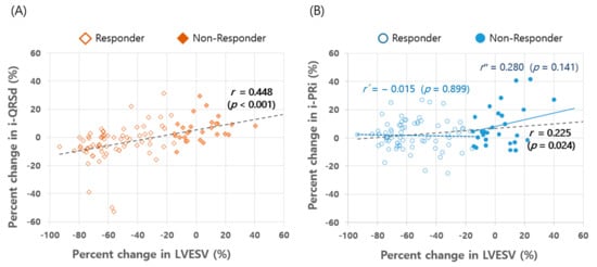 To evaluate the relationship between structural and electrical reverse remodeling, we tested the correlation between percent changes in the LVESV and i-QRSd or i-PRi. A moderately strong positive correlation was found between percent reductions in the LVESV and the i-QRSd (r = 0.448, p < 0.001) (Figure 3A). In contrast, the relative change in i-PRi showed only a weak positive correlation with the relative change in LVESV as a whole (broken black line, r = 0.225, p = 0.024) (Figure 3B). However, in the responder groups (n = 71), the significant correlation between the relative changes in the LVESV and i-PRi disappeared (broken blue line, r′ = −0.015, p = 0.899). In the non-responder group, the i-PRi was likely to increase further with LVESV enlargement (solid blue line, r″ = 0.280, p = 0.141) (Figure 3B).