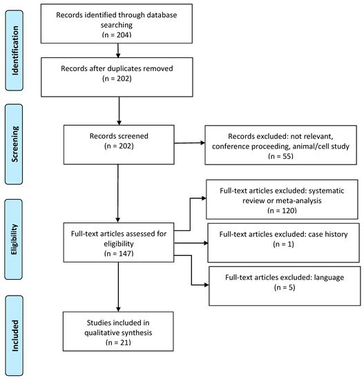The search returned 204 research titles (Figure 1). Excluded were two as duplicates, 18 as irrelevant, 33 as conference abstracts, four as animal studies, 120 as reviews or metanalysis, one as a case history and five on language. The remaining 21 original articles met the inclusion criteria, one being published as interim [45] and final [46] study reports. Studies were from Europe (11/20), East (4/20) and South East (3/20) Asia and the Middle East (2/20).