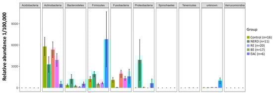 The control microbiota had higher levels of Gram-positive Firmicutes and Actinobacteria compared to other groups. The NERD microbiota composition shifted towards Proteobacteria (Neisseria oralis and Moraxella sp.) and Bacteroidetes (Bacteroides uniformis, Capnocytophaga sp., and Prevotella pallens), and away from Fusobacteria (Leptotrichia) and Actinobacteria (Rothia). Several Firmicutes genus were reduced in NERD (Peptococcus and Moryella), while an increased abundance of Dorea resulted in an overall higher Firmicutes composition compared with control. The RE and BE microbiota were characterized by a shift away from Firmicutes (Mogibacterium sp., Streptococcus infantis, Solobacterium moorei) and towards Gram-negative Fusobacteria (Leptotrichia sp.) and Proteobacteria (Marivita, Nisaea, Mesorhizobium) relative to controls. The EAC microbiota was characterized by a shift towards Firmicutes, mainly Staphylococcus aureus, Streptococcus infantis, Moryella sp. and Lactobacillus salivarius, and Proteobacteria, while away from Actiobacteria (Rothia mucilaginosa) relative to controls.