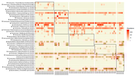 Heatmap representation of 41 differential operation taxonomic units (OTUs) between control (CON; n = 16) and disease phenotypes (non-erosive reflux disease (NERD; n = 11), reflux esophagitis (RE; n = 20), Barrett’s esophagus (BE; n = 17), and esophageal adenocarcinoma (EAC; n = 6)). OTUs from each disease phenotype were compared by multivariant analysis (anova.manyglm; p-value < 0.05). p-values are shown in brackets ( ), taxa classified above genus level are denoted in [ ]. Pairwise analysis identified differences in OTU associated with specific disease phenotype(s), these markers are grouped by black outlines. Trend-of-change for each marker within the phenotype is indicated with an arrow.