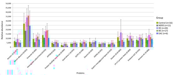Protein abundance in 15 differential proteins between control and disease phenotypes are presented. p-values obtained by Kruskal-Wallis test are displayed in brackets ( ). Non-erosive reflux disease (NERD); reflux esophagitis (RE); Barrett’s esophagus (BE); esophageal adenocarcinoma (EAC); ATP synthase subunit beta (ATP5B); glutathione S-transferase p (GSTP1); Endoplasmic reticulum chaperone BiP (HSPA5).