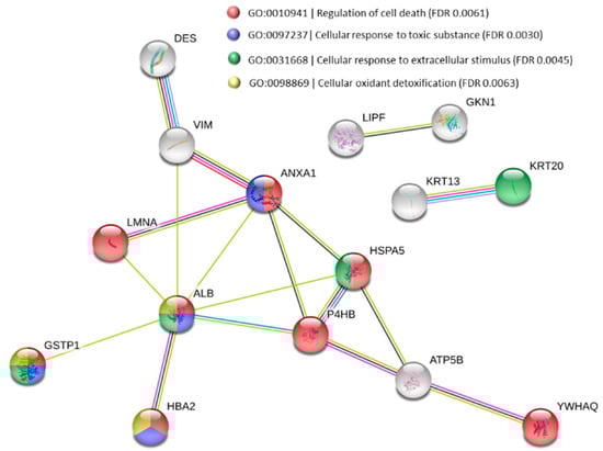 Protein–protein interaction map of 15 differential proteins between test groups. Three biological processes were characteristic of disease progression. Nodes are representative of protein species and lines represent protein–protein association. Nodes of the same color and/or joined by lines represents to a shared function. The STRING tool (http://www.string-db.org) was used to construct the interaction networks. Desmin (DES); vimentin (VIM); annexin A1 (ANXA1); prelamin-A/C (LMNA); serum albumin (ALB); glutathione S-transferase p (GSTP1); hemoglobin subunit beta (HBA2); Endoplasmic reticulum chaperone BiP (HSPA5); protein disulfide-isomerase (P4HB); ATP synthase subunit beta (ATP5B); 14-3-3 protein theta (YWHAQ); gastric triacylglycerol lipase (LIPF); gastrokine-1 (GKN1); keratin 13 (KRT13); keratin 20 (KRT20).