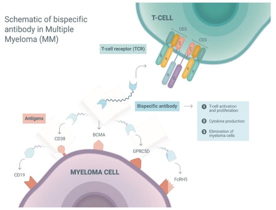 - Usmani, S.Z.; Mateos, M.-V.; Nahi, H.; Krishnan, A.Y.; van de Donk, N.W.C.J.; Miguel, J.S. Phase I study of teclistamab, a humanized B-cell maturation antigen (BCMA) × CD3 bispecific antibody, in relapsed/refractory multiple myeloma (R/R MM). J. Clin. Oncol. 2020, 38 (Suppl. 15), 100. [Google Scholar] [CrossRef]