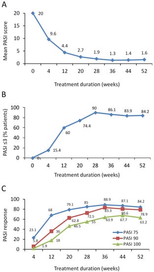 Clinical efficacy was evaluated using PASI 75 90 100 (a 75%, 90%, 100% reduction in the PASI score) at the following time points: 4, 12, 20, 28, 36, 44, and 52 weeks. Primary inefficacy (failure to achieve PASI 75 after 16 weeks of treatment) or secondary inefficacy (loss of PASI 75 after 16 weeks of treatment) were also assessed.