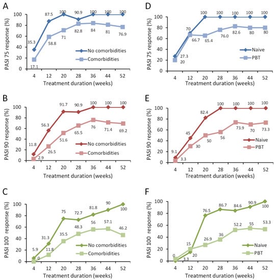 Effect of guselkumab in subgroups of psoriatic patients on achievement of PASI 75, 90, and 100 response over 1 year. (A–C) The % patients with comorbid diseases (n = 35) compared to those without comorbid diseases (n = 17) in achieving PASI 75 (A), 90 (B), and 100 (C) response are presented for each time point. (D–F) The % patients naïve to previous biological treatment (n = 22) compared to those having previously received biological treatment (PBT; n = 30) in achieving PASI 75 (D), 90 (E), and 100 (F) response are presented for each time point. The % of patients at each time point is shown.