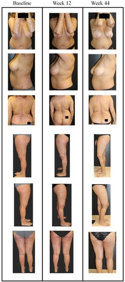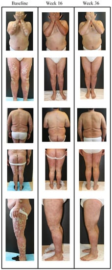 In patients with <3 PBTs, PASI 75, 90, and 100 response was 87.5%, 87.5%, and 75%, respectively, vs. 71.4%, 57.1%, and 28.6%, respectively, in patients treated with ≥3 PBTs (Figure S1). Images showing improvement following guselkumab treatment in a patient with hypertension who was not responsive to traditional systemic drugs, anti-TNFα, or anti-IL17A treatment is shown in Figure 5.