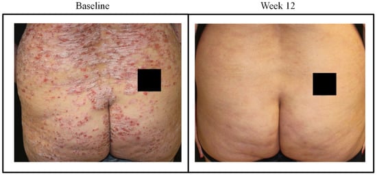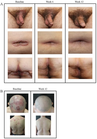 Representative images of two cases with moderate-to-severe plaque psoriasis in difficult-to-treat locations treated with guselkumab are shown in Figure 5. In a male patient with psoriasis in the suprapubic area and penis foreskin, umbilicus/periumbilical, and perianal regions, treatment with guselkumab led to complete clearance of plaques by 12 weeks (Figure 6A). A male patient with plaque psoriasis of the scalp and upper shoulder region also showed almost complete clearance after 12 weeks with guselkumab (Figure 6B).