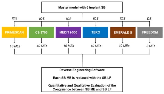 Hence, the aim of this in vitro study was to assess and compare the reliability of five different IOSs in the capture of implant SBs, to verify the dimensional congruence between the MEs of the scan abutments captured during the scan of a complete arch model with six implants, and the corresponding LF. The evaluation of the deviations between the MEs of the SBs and the LF was performed using reverse engineering software able to quantitatively and qualitatively assess the incongruences. The null hypothesis was that there was no quantatitive nor qualitative difference between the MEs of the SBs and the LF, and that there were no differences between the different IOSs evaluated.