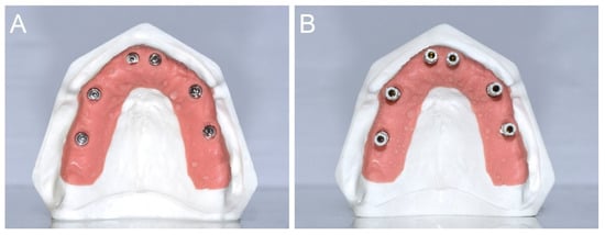 (A) A type IV gypsum cast with pink gingiva in the scanabutment area, and the implant analogues in position # 16 (S1), # 14 (S2), # 11 (S3), # 21 (S4), # 24 (S5), and # 26 (S6), respectively, was prepared for the study. (B) The gypsum cast with the SBs in position. The SBs were positioned fairly parallel each other.