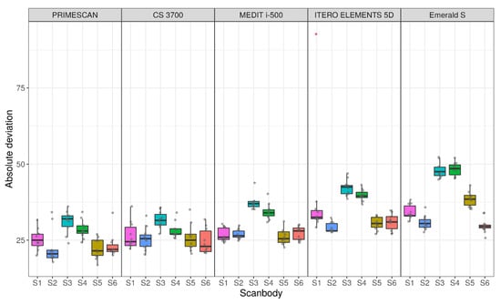 All the data collected were included in datasheets used for statistical analysis. The sample size was determined sufficient for the analysis by a professional statistician. Data analysis and visualisation were performed using R (version 3.6.3) environment for statistical computing (R Foundation for Statistical Computing, Vienna, Austria). For the quantitative evaluation, descriptive statistics for absolute deviations were presented as means (±SD), medians (1st and 3rd quartiles, Q1–Q3), ranges, and 95% CIs. Sample distributions of absolute deviations across different scanners and SBs were visualised using box plots. An observation obtained from S1 SB using the ITERO ELEMENTS 5D® scanner was considered an outlier and not used in the parametric estimation and hypothesis testing procedures. A linear mixed-effects model (implemented in lme4 1.1–21 package) was used to estimate and compare the mean absolute deviations between the IOSs (this model allowed accounting that data have hierarchical properties: scanner → SB). The Tukey method (implemented in emmeans 1.4.5) was used to adjust p-values and confidence limits. A linear model (two-way ANOVA with interaction) was used to compare the mean absolute deviations between SBs for each scanner. The Tukey method was used to adjust p-values and confidence limits. The Friedman rank test was used to compare models in each type of scanner (SB was considered the blocking variable) with the Holm procedure for multiple testing adjustment. Agglomerative hierarchical biclustering was used to explore scanner–SB relationships regarding averages and variability of the absolute deviations. In order to reduce the α error, the significance level for all tests was established at p < 0.01.
