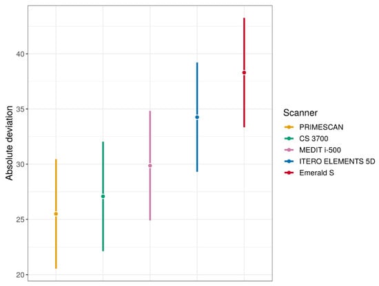 The comparison of the deviations between the SBs in each group of IOSs with the results of estimation and testing using the linear model (two-way ANOVA with interaction) with a p-value for interaction <0.0001 is summarised in Figure 7 (means and 95% CIs for each type of scanner), Table 4 (pairwise differences between means and 95% CIs for differences), and Table 5 (p-values for pairwise comparisons).