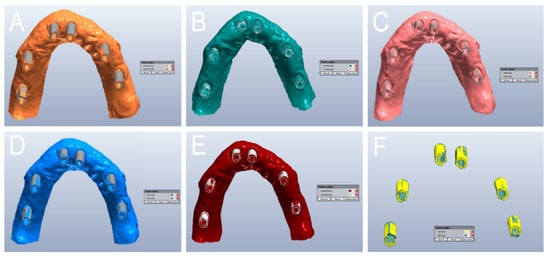 Qualitative evaluation of the deviation patterns (occlusal view of the model). (A) With PRIMESCAN®, the SB meshes (MEs) were included inside the SB library files (LFs). (B) With CS 3700®, the SB LFs were included inside the SB MEs. (C) With MEDIT i-500®, a remarkable interpolation between the SB ME and the SB LF was seen, with no clear direction for the deviation. (D) With ITERO ELEMENTS 5D®, the SB MEs were included inside the SB LFs. (E) With Emerald S®, the SB MEs were included inside the SB LFs. (F) With DOF UHD®, the SB LFs were included inside the SB MEs.