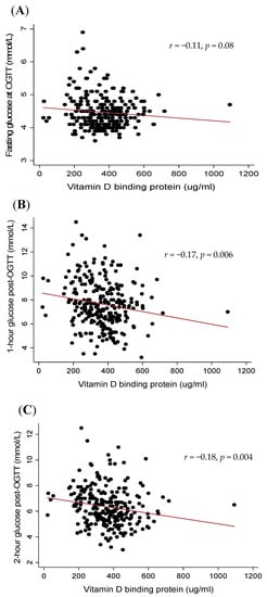 Scatterplots illustrating the correlations between vitamin D binding protein with fasting glucose (A); 1 h glucose (B); and 2 h glucose (C) post-oral glucose tolerance test (OGTT).
