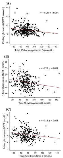 Scatterplots illustrating the correlations between total 25(OH)D with fasting glucose (A); 1 h glucose (B) and 2 h glucose (C) post-oral glucose tolerance test (OGTT).