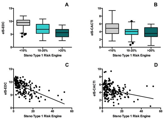 Comparison of eIS-EDC (estimated insulin sensitivity developed from the Pittsburgh Epidemiology of Diabetes Complications Study) (A) and eIS-CACTI (estimated insulin sensitivity developed from Coronary Artery Calcification in T1DM Study) (B) for the Steno Type 1 Risk Engine low (<10%), moderate (10–20%) and high-risk (≥20%) groups. Spearman correlation coefficient for the association between eIS-EDC (C) and eIS-CACTI (D) and Steno Type 1 Risk Engine risk score.