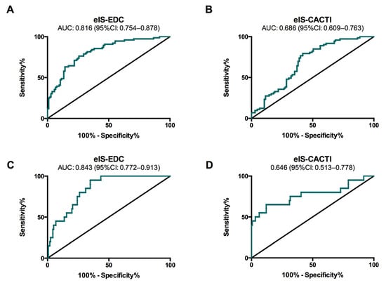ROC curves for eIS-EDC and eIS-CACTI to identify cardiovascular risk according to the Steno Type 1 Risk Engine for moderate/high (A,B) and high-risk (C,D) groups.