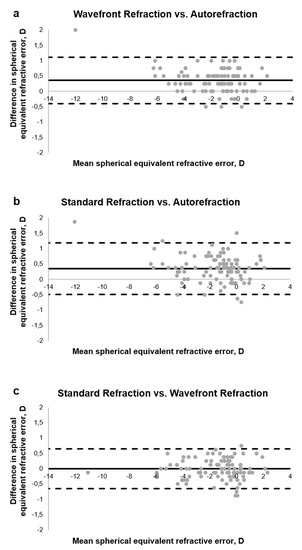 Figure 1a represents the Bland–Altman plots for the comparison of the spherical equivalent refractive error computed from Autorefraction vs. the Wavefront Refraction and Figure 1b represents the comparison between the Autorefraction vs. the Standard Refraction.