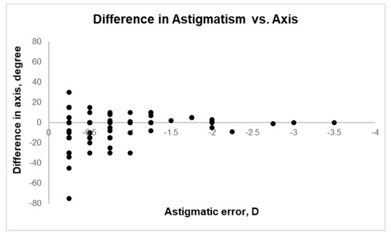 The bias between two methods as well as the 95% limit of agreement were calculated for the power vectors M, J0 and J45. These power vectors lend itself to calculations of sums, differences, and averages and are the correct form for describing refractions for such measures. Nevertheless, especially in case of the cylinder and its axis, these are not the ideal notations to get an overview, if the data obtained with an autorefractor and with a subjective refraction are equal or differ, e.g., depending on the amount of astigmatism or on its axis. Therefore, a comparison between the measured astigmatism and its axis between the autorefraction data and the values from the Standard Refraction was performed, following the analysis by Grein et al. [19]. In Figure 2, the discrepancy for the axis, based on the objective measurement of the wavefront errors and with the Standard Refraction, is analyzed depending on the power of the astigmatic error. It must be noted that in this analysis, an astigmatism was only considered if it was found in both methods of refraction, therefore, only data of 85 eyes were analyzed. A positive difference means a change of the axis into the clockwise direction, whereas a negative difference is equal to a counterclockwise change.