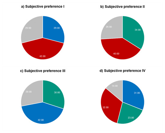 Subjective preferences for direct comparisons of methods (Figure 3a–c) and between methods. (a) Autorefraction (red) vs. Wavefront Refraction (blue), (b) Autorefraction (red) vs. Standard Refraction (green), (c) Standard Refraction (green) vs. Wavefront Refraction (blue), and (d) Standard Refraction (blue) vs. Wavefront Refraction (green) vs. Autorefraction (red). Gray area: no difference.