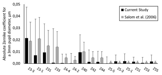Comparison of the absolute Zernike coefficient (µm) for the higher order aberrations until fifth order from the current study to normal human subjects for a 3 mm pupil diameter (data from Salmon et al. [33]).