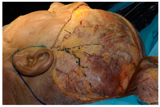 Exposure of the entirety of the frontal, temporal, and parietal regions of fixed cadavers. The superficial temporal artery, anterior and posterior branches (arrows) and superficial temporal vein, anterior and posterior branches (stars) are shown.