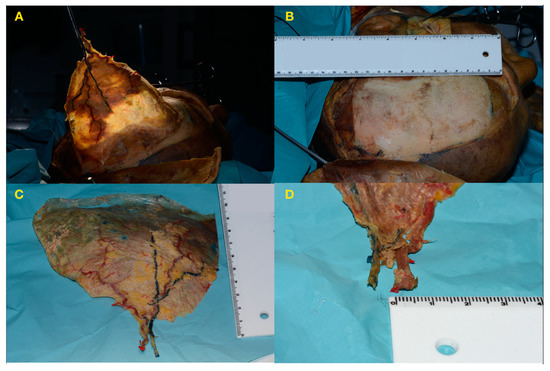 Completion of pericranium dissection and flap harvesting. Detachment and measurement of the flap and vessels. (A): A large view. (B): Donor area measurement. (C): Flap measurement. (D): Vessel measurement.
