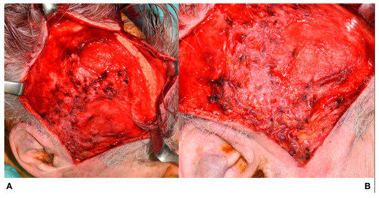 (A): The pericranium is incised followed by blunt dissection of the pericranium from the bone. (B): Skin flap showing preserved superficial temporalis vessels.