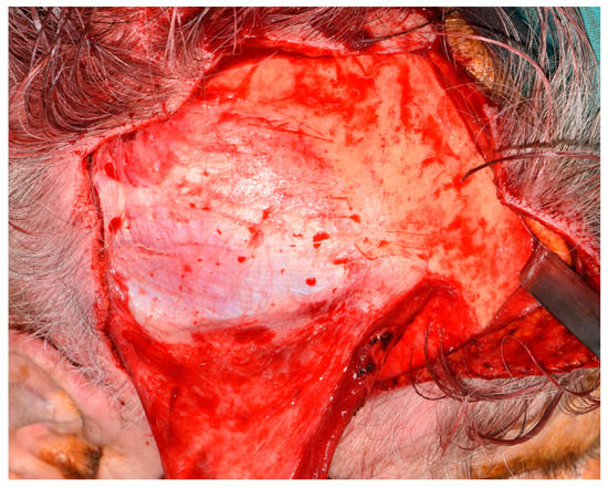 The surgical access route was the same as for harvesting a muscle rotation flap, that is, the incision extended from the preauricular region to the upper temporoparietal skin. After incising the skin in the preauricular region, the main trunks of the STA and STV were separated, and the skin flap was elevated by sharp dissection along the subcutaneous layer to preserve the superficial temporalis blood supply. After achieving the extended surgical exposure required to raise a galea-pericranium flap, the pericranium was incised and detached from the bone, with great care being taken to preserve tissue integrity, as shown in Figure 3.