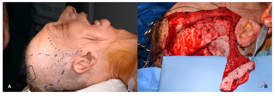 - Ozerdem, O.R.; Anlatici, R.; Sen, O.; Yildirim, T.; Bircan, S.; Aydin, M. Prefabricated galeal flap based on superficial temporal and posterior auricular vessels. Plast. Reconstr. Surg. 2003, 111, 2166–2175. [Google Scholar] [PubMed]