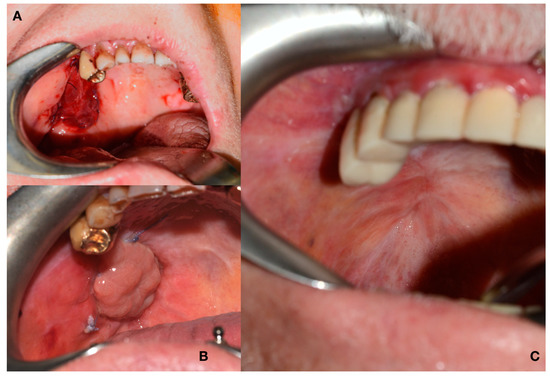 Reconstruction outcomes. Case 1. (A): The intraoral insert. (B): 2 weeks after surgery. (C): 3 months after surgery.