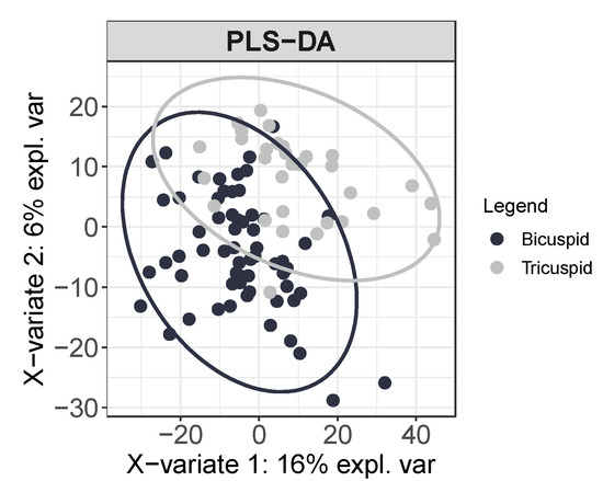 Using this high-throughput approach, we detected 2289 distinct metabolite features in plasma samples. As an exploratory analysis, using unsupervised principal component analysis (PCA), we firstly corroborated the absence of outliers, trends, patterns or clusters in the data prior to statistical analysis. Moreover, using a supervised partial-least-squares discrimination analysis (PLS-DA), we determined that by measuring the metabolomic plasma profile, patients can be classified depending on the bicuspid or tricuspid morphology of their aortic valves (Figure 1). Thus, from the 2289 metabolite features measured, 2 unique metabolites were significantly different between TAV and BAV, namely, alpha-Tocopherol (fdr = 2.17 × 10−3) and choline (fdr = 8.44 × 10−3) and both metabolites presented lower abundance in the plasma of BAV patients than in that of TAV patients.