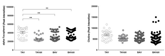 Peak intensities measured for the alpha-Tocopherol and choline levels in TAV and BAV patients. n = 202. ** p-value < 0.01.