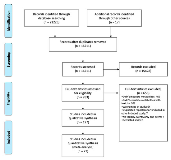 The adopted study selection strategy is detailed in Figure 1. From the initial 21,240 reports, after duplicates removal, initial screening and full-text retrieval and analysis, 127 articles met the criteria for qualitative synthesis. Of these, 72 had appropriate data to be included in the meta-analysis.