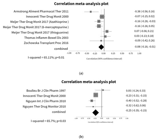 On this topic, 5 studies [34,36,48,81,108] evaluated the relation between 6-TGN levels and hemoglobin and registered a significant but weak weighted mean correlation (Figure 2a). When the analysis was restricted to studies with IBD patients [34,36,48], the strength of the correlation improved (r = −0.28, 95% CI −0.50; −0.06; p = 0.01) (Figure S4). However, in the two studies that included patients on thiopurines monotherapy, the weighted mean correlation was not statistically significant, albeit with considerable heterogeneity (r = −0.10, 95% CI −0.36; 0.17; p = 0.48) (p < 0.01, I2 = 88%). Regarding the relationship between 6-TGN levels and erythrocytes count [54,81,93,94], the heterogeneity between studies was substantial and the correlation between variables was significant but weak (Figure 2b). The strength of the correlation improved when the analysis was restricted to studies with patients on thiopurines monotherapy (r = −0.39, 95% CI −0.42; −0.35; p < 0.01), with no heterogeneity among studies (p = 0.01, I2 = 0%).