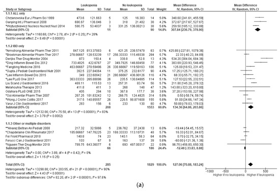In a pooled analysis of 22 reports [40,46,48,56,57,58,65,67,70,72,73,75,84,85,91,92,94,96,98,103,105,107], 6-TGN concentrations were significantly higher in patients with leukopenia (mean difference of 127.06 pmol/8 × 108 RBC (95% CI 70.88; 183.24; p < 0.01)). We could observe a considerable heterogeneity between studies (p < 0.01; I2 = 90%). The underlying disease showed to have influence on the results: 6-TGN levels were higher in patients with leukopenia only in leukemic and IBD patients, whereas no differences could be reported for other disorders (Figure 3a). Restricting the analysis to patients using thiopurines in monotherapy did not change the results (mean difference of 120.44 pmol/8 × 108 RBC (95% CI 31.06; 209.83; p < 0.01) (p < 0.01; I2 = 86%).