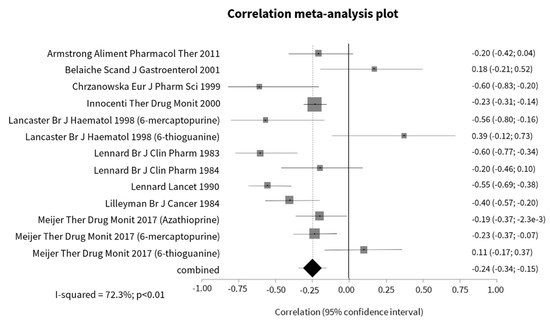 Our analysis could not denote a significant correlation between 6-MMPR levels and leucocytes (r = −0.04, 95% CI −0.12; 0.04; p = 0.29) (Figure S6) [36,37,55,58,94,108]. However, when the analysis was restricted to studies including patients with less than 8 weeks of treatment at the time of assessment, the correlation was significant (r = −0.22, 95% CI −0.34; −0.09; p < 0.01).