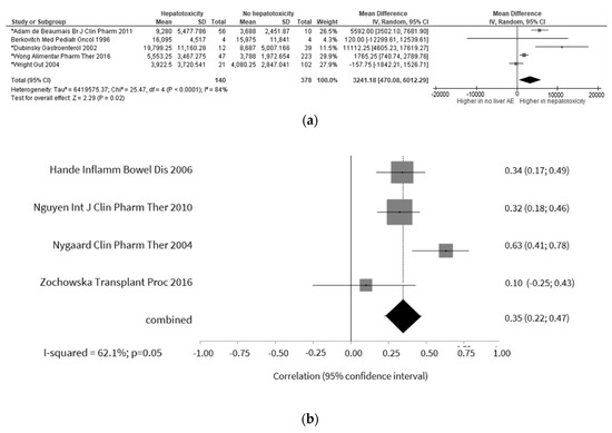 Our analysis evidenced that 6-MMPR concentrations were higher in patients with hepatotoxicity, with a mean difference of 3241.2 pmol/8 × 108 RBC (Figure 5a) [44,53,68,104,106]. Nonetheless, the degree of heterogeneity between these studies was considerable. Restricting the analysis to studies reporting the use of thiopurines in monotherapy lead to non-statistically significant differences, also with considerable heterogeneity (mean difference of 5021.01 pmol × 108 RBC, 95% CI −5987.12; 16,029.15; p = 0.37) (p < 0.01; I2 = 91%).