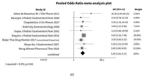 Nine studies provided data for the calculation of a pooled OR [14,36,44,50,57,75,82,102,104]. It was possible to conclude that patients with 6-MMPR levels above the defined thresholds, ranging from 3615 to 5700 pmol/8 × 108 RBC, were about four times more likely to develop hepatotoxicity (Figure 5c). When the analysis was restricted to studies reporting the use of thiopurines in monotherapy, the results were similar (OR 4.78; 95% CI 3.18; 7.19; p < 0.01) (p = 0.42; I2 = 0%).