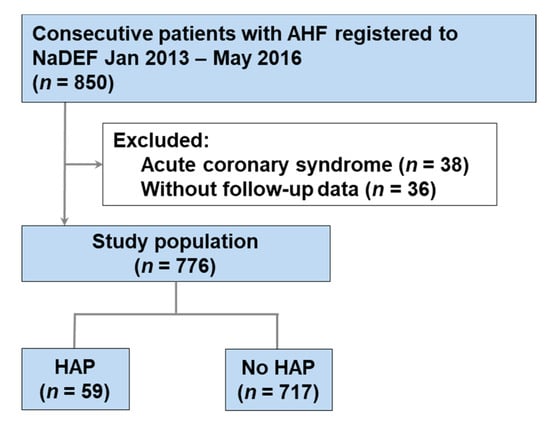 Flow diagram of the study. AHF—acute heart failure; NaDEF—National Cerebral and Cardiovascular Center Acute Decompensated Heart Failure; HAP—hospital-acquired pneumonia.