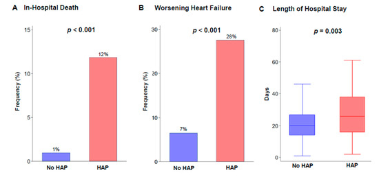 Incidence of adverse events during hospitalization. (A) In-hospital death, (B) Worsening heart failure, (C) Length of hospital stay. HAP, hospital-acquired pneumonia.