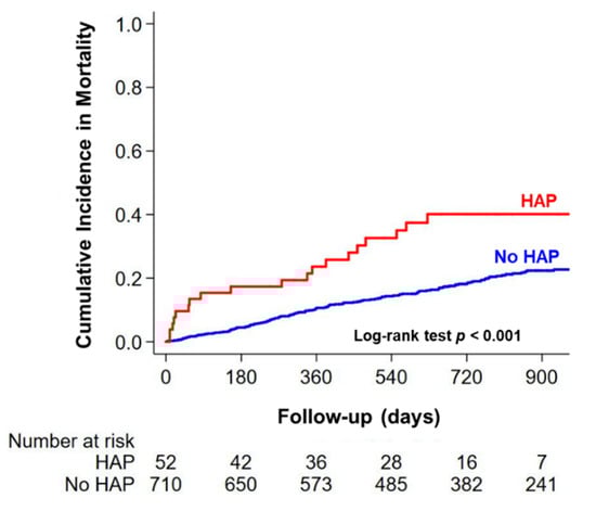 Interestingly, HAP development was also associated with worse long-term survival outcomes even after adjusting for the powerful prognostic factors for AHF. The exact reason for this finding is unclear; however, we can speculate as follows. First, persistent inflammation after pneumonia can contribute to subsequent CVD progression [8,30]. One prospective cohort study has shown that patients with pneumonia who left the hospital with higher interleukin-6 levels at discharge were associated with increased subsequent mortality despite clinical recovery [31]. Second, higher levels of coagulation markers are also commonly observed at the time of hospital discharge in patients who have recovered from pneumonia. One study showed that higher D-dimer and thrombin-antithrombin complex levels were associated with a higher risk of subsequent death, particularly due to CVD [32]. These pro-inflammatory and hypercoagulable states may increase the risk of cardiovascular events including myocardial infarction or cerebral infarction [33]. Finally, acute organ injury such as acute lung or kidney injury due to pneumonia during hospitalization might progress to organizing pneumonia or chronic kidney disease after discharge, leading to worse long-term clinical outcomes.