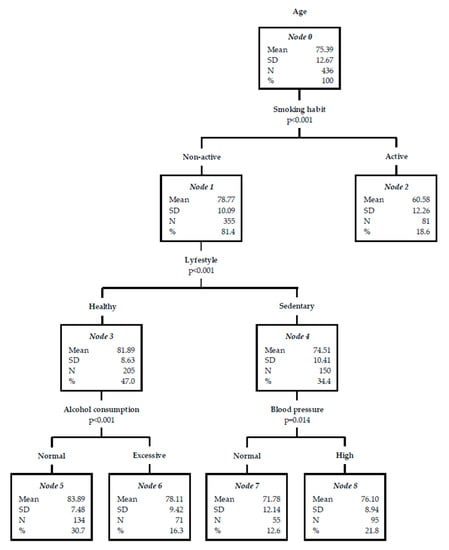 Finally, to interpret the observed associations and find other specific subgroups and relationships that may not be obtained through a multivariate regression analysis, a decision tree was made (Figure 1). As seen at node 5, no smoking patients, with a healthy lifestyle, and non-excessive alcohol consumption suffered a cerebrovascular event at an older age (mean 83.89 ± SD 7.48 years). On the other hand, according to the results of node 2, a stroke occurs at a lower age among patients with an active smoking habit (mean 60.58 ± SD 12.26 years). In this decision tree, the estimated risk based on the cross validation method was 101.08 (Standard Error = 8.12).