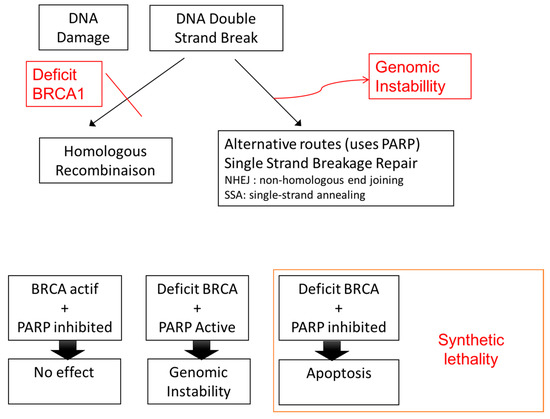 Between 30% and 40% of patients with type II EOC have a BRCA mutation. The BRCA1 gene is located on chromosome 17. BRCA1 mutations are of germline or somatic origin in 11.5% of cases and of epigenetic origin (inactivation due to gene promoter methylation) in 10.5%. The BRCA2 gene is located on chromosome 14 and 9.2% of patients have germline or somatic mutations [36]. BRCA mutant carriers have a better prognosis than wild-type carriers or patients with epigenetic silencing [12]. BRCA genes are involved in DNA double-strand break repair by homologous recombination. When DNA damage occurs (induced, for example, by platinum-based chemotherapy), there are two possible repair pathways: the homologous recombination double-strand DNA repair pathway and the alternative single-strand break repair pathway, which involves a group of non-homologous end joining (NHEJ) genes and single-strand annealing (SSA) genes that use several enzymes, including PARP (Figure 1). In the absence of double-strand break repair due to, for example, deficient BRCA1 or BRCA2 function, the default single-strand repair pathway is engaged, but this results in genomic instability in the reading frame and genomic mutations. This instability would explain the higher prevalence of EOC in patients with BRCA1 or BRCA2 mutations, as there would be an accumulation of cell clones harboring activating mutations in oncogenes or inhibiting mutations in tumor suppressor genes. Defective DNA repair at the tumor level exists in EOC, as 30% to 40% of patients have a non-functional BRCA gene. This deficiency probably explains the better prognosis observed in carriers of BRCA mutations when their tumor is subjected to selective pressure imposed by platinum-based chemotherapy, as the single-strand repair capacity would probably be exceeded. Accumulation of unrepaired DNA damage results in cell apoptosis once a certain threshold is passed. PARP inhibitors such as olaparib can be used to exploit double-strand DNA repair deficiencies by inhibiting the single-strand DNA repair pathway and preventing DNA repair in patients treated with platinum-based chemotherapy. In the presence of cumulative unrepaired DNA damage, the tumor cells would enter apoptosis. This process is known as synthetic lethality. Synthetic lethality induced by PARP inhibitors has been found to result in a significant clinical benefit in patients with ovarian cancer. Specifically, carriers of constitutional (inherited) or somatic (acquired) BRCA mutations achieved a significant gain of seven months disease-free survival in patients treated with olaparib maintenance therapy for at least nine months [37]. A number of questions, however, remain in relation to the use of PARP inhibitors. First, would PARP inhibitors benefit patients who lack BRCA expression due to epigenetic inactivation through DNA methylation? Second, would all EOC patients with a BRCAness profile benefit from PARP inhibitors, i.e., patients with a mutation in any of the proteins responsible for double-strand DNA repair (homologous recombination) whether that be BRCA or BRIP2, CHEK2, RAD51c, or PTEN [38,39]? Third, can the somatic characterization of the BRCAness profile be simplified in order to offer theranostic options to patients other than those with congenital BRCA mutations? Although the definition of BRCAness varies from one series to the next, molecular profiling of high-grade serous EOCs has shown that 30% to 60% of patients have deficiencies in homologous recombination or other DNA repair pathways [14,38,40]. A number of studies have attempted to identify molecular signatures that would provide a simple, reproducible method for predicting BRCAness profiles based on genomic instability [41,42]. Similar studies have been conducted in the field of breast cancer, particularly triple-negative breast cancer [43,44]. The difficulty with these studies is the lack of consensus on the molecular definition of BRCAness. The strategy proposed for overcoming this difficulty in therapeutic trials is to use PARP inhibitors for patients who respond well to platinum-based drugs and therefore theoretically have defective double-strand DNA repair. Two examples are the phase II ARIEL3 trial with rucaparib and the NOVA trial with niraparib. The NOVA trial showed that niraparib was effective in patients with platinum-sensitive ovarian cancer, demonstrating that PARP inhibitors are effective in carriers of mutations other than BRCA1 and BRCA2 [24]. Efforts are also underway to analyze the combined use of drugs with different effects. Researchers in the PAOLA trial, for example, recently showed that the combined use of PARP inhibitors and antiangiogenic agents as first-line maintenance therapy for patients with ovarian cancer is superior to bevacizumab alone [45,46].