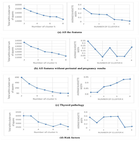 Table 2 shows the clusters, from 2 to 8, with the number of women in each one. In the case of (a) all features, after four clusters, the number of patients is small in some of the subgroups (i.e., Cluster 5 with 15 women in group 2). Based on the results provided by the silhouette, the best cluster number is k = 2. Similar to (a) all features, after four clusters, the (b) features without perinatal and pregnancy results start to present clusters with small values (i.e., Cluster 5 with seven women in group 4) and the best cluster number should be k = 2. Taking out clusters two and three, there is, for (c) thyroid pathology, a small number of women in the remaining clusters (i.e., Cluster 4 with 28 women in group 0 and 26 in group 2). The silhouette method has great results due to the small size of the subsets of the different clusters and is not reliable; based on this, we selected k = 2 and k = 3. After two clusters, for (d) risk factors, there is a small number of women (i.e., Cluster 3 with five women in group 1). According to these observations, we defined k = 2 as the optimal number of clusters in the data.